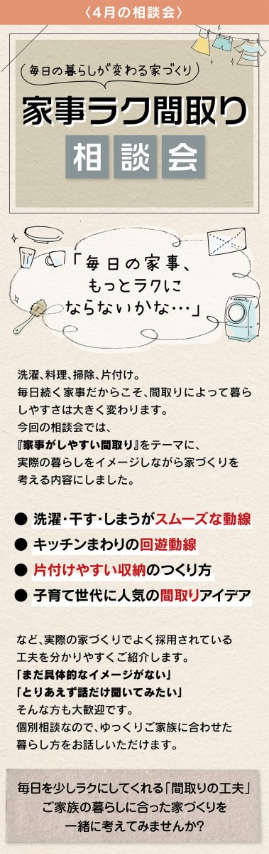 家事ラク間取り相談会開催。洗濯や収納、キッチン動線など暮らしやすい間取りの工夫を分かりやすくご紹介。子育て世代にも人気の家事動線を個別相談でご提案します。