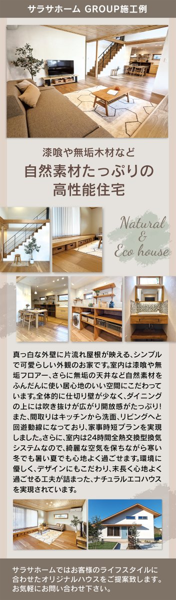 自然素材と開放感ある吹き抜けが魅力のナチュラルエコハウス。回遊動線や全熱交換型換気システムで家事効率と快適性を両立した、環境にも優しい住まいです。