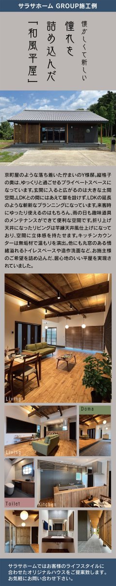 京町屋風のY様邸は、縦格子の奥に土間空間を設けた斬新な平屋。吹き抜け風の竿縁天井や無垢材カウンター、丸窓のトイレなど、情緒と快適性を兼ね備えた住まいです。
