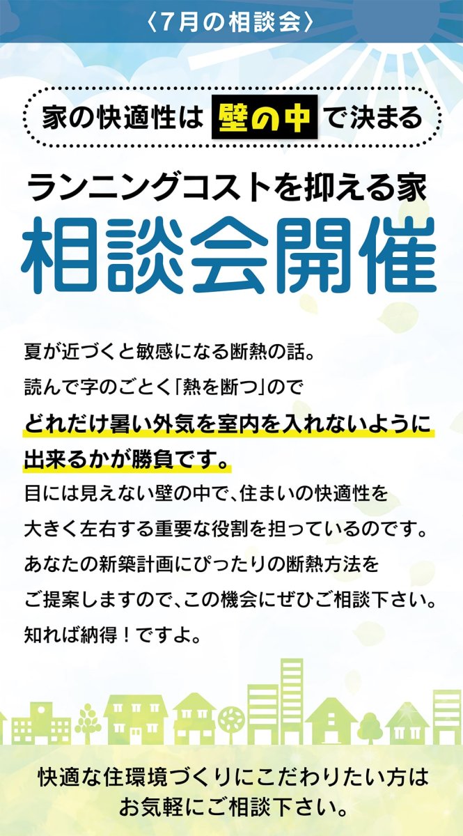 夏に欠かせない断熱対策。目に見えない壁の中で快適な室内環境を守る重要な役割を果たします。最適な断熱方法をご提案しますのでご相談ください。