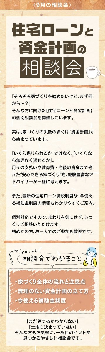 住宅ローンと資金計画の個別相談会開催。無理なく返せる額を重視し、教育費や老後資金も考慮。減税制度や補助金情報も提供し、安心の家づくりをサポート。