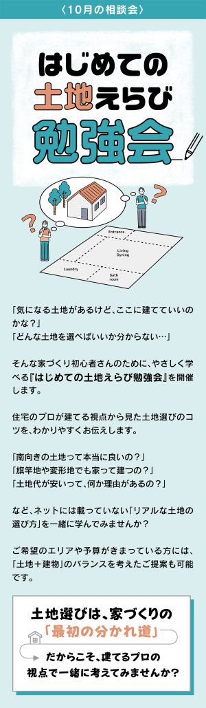 家づくり初心者向け「はじめての土地えらび勉強会」。プロが南向きや旗竿地などネットにない土地選びのコツを解説。エリアや予算に合わせた提案も可能。