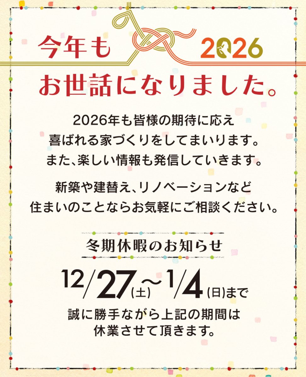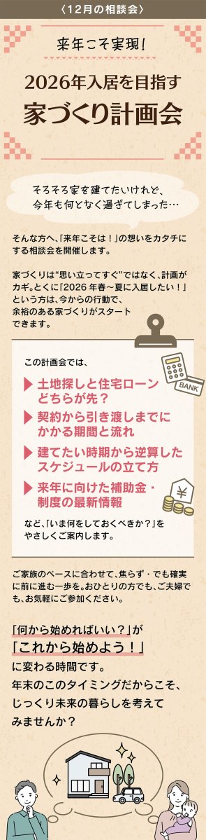 2026年入居を目指す家づくり計画会では、土地探しやローンの順序、契約〜引き渡しの流れ、逆算スケジュール、来年の補助金などを分かりやすく解説。“来年こそ家づくりを進めたい”ご家族をサポートします。